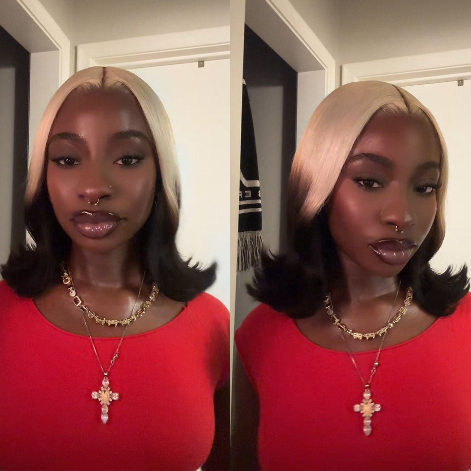 ZSF Fashion Gradient Color Ice Blonde With Black Bob Straight Virgin Hair Lace Wig Invisible Knots Hair